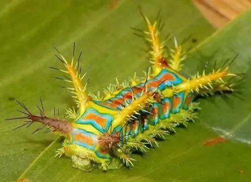 生活在各种树上啊,它们的颜色很好看,像一颗颗荧光绿的糖果,但是呢,身上却有非常密集的坚硬的毒刺,如果碰到的话,会使皮肤感到火辣辣的痛,所以也被叫做火辣子,八角钉,好在这样的症状,一般过两天就没事儿了,