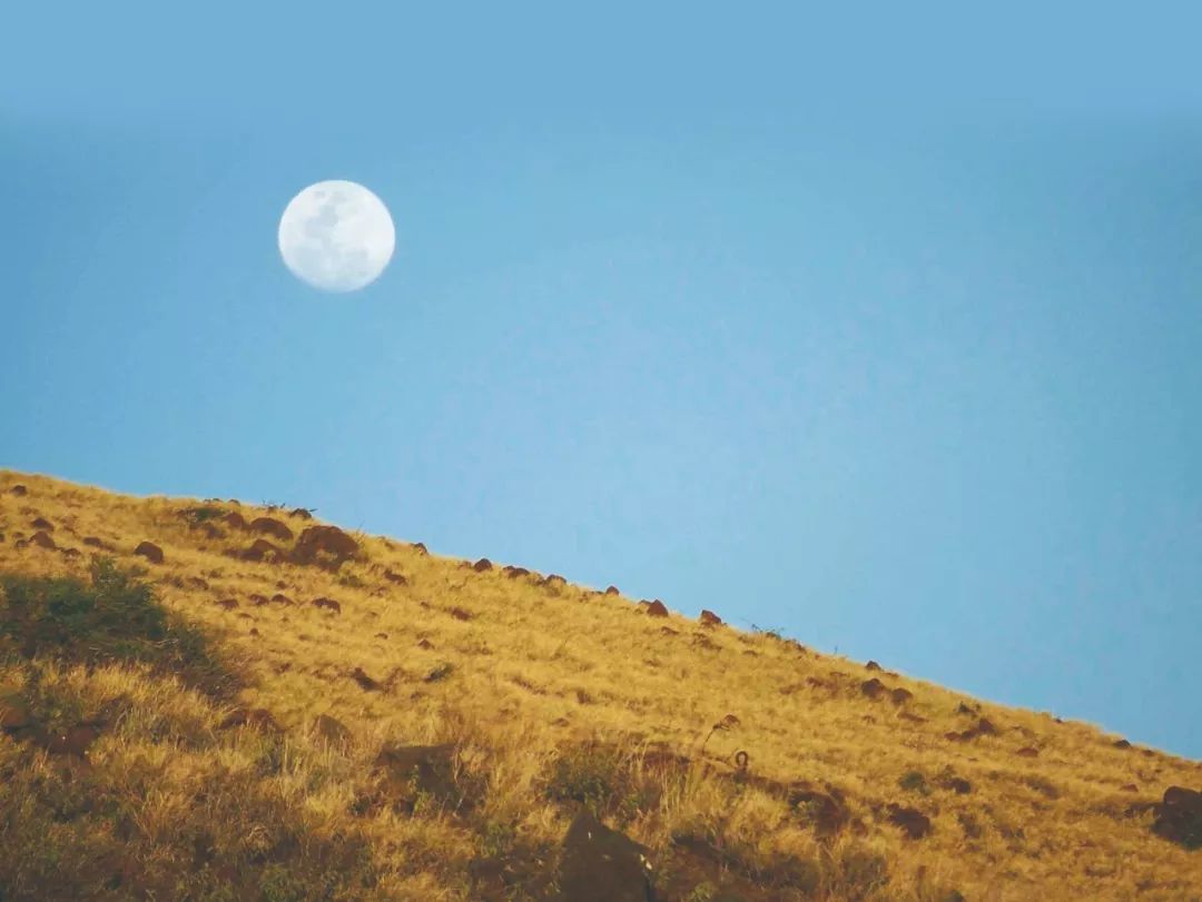 月亮社牛发作时,大白天也敢出来晃悠。只是太阳这个超级灯泡太亮,把它衬得像教室后排的透明人。