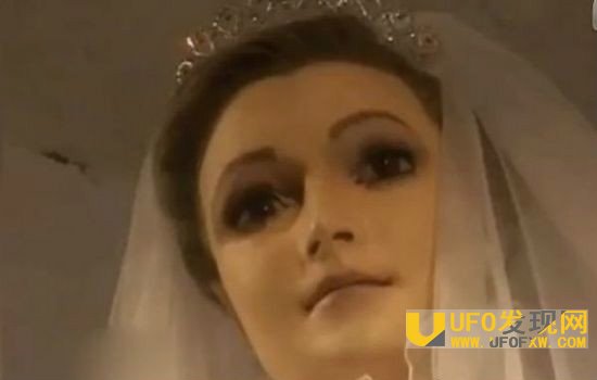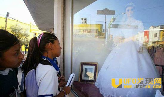 在墨西哥北部的一家婚纱店里,一尊栩栩如生的人体模特站立在橱窗前,橱窗里的模特是一尊新娘模特,她身材高挑、亭亭玉立,手里捧着大团玫瑰花,看起来像真的一样。