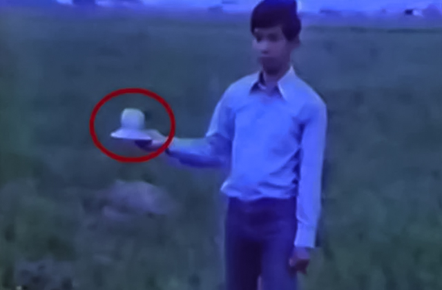 与此同时这个飞行物大放光明,光亮特别耀眼,然后突然又落到了地上,然而这个东西并没有停止,确切说它在地面上依然在保持转动,当他们感觉没有动静了后变再次小心翼翼的接近,靠近了大家才发现这个东西很小,胆大的洪志捡起了这个东西,并且其他人还帮洪志拍了一张手持飞碟的照片,